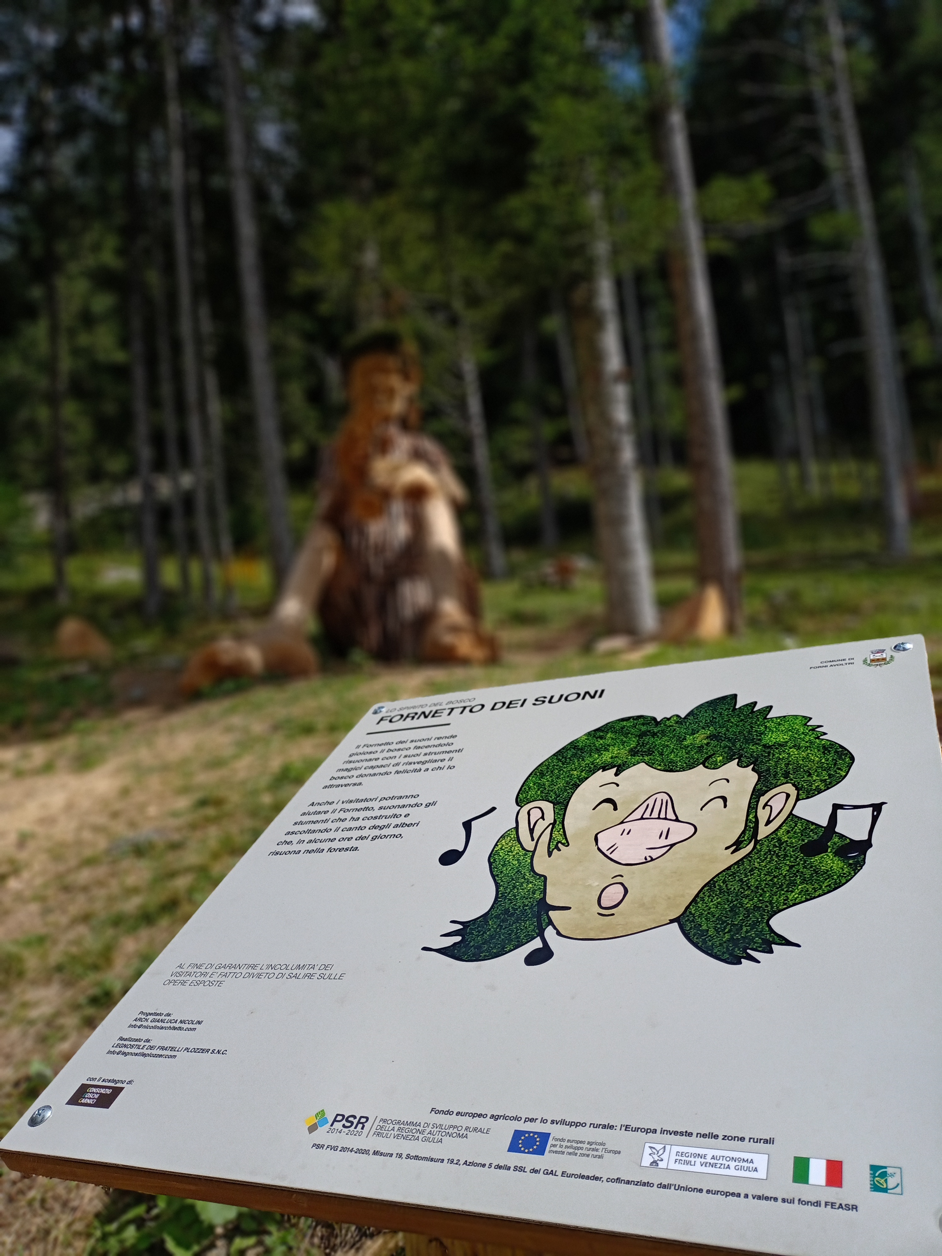 Frino, lo spirito del bosco, è il padrone di queste montagne ed assieme ai suoi abitanti, i Fornetti (Fornets) ce la sta mettendo tutta per far tornare a splendere queste foreste dopo il passaggio del drago. In quella notte di ottobre del 2018 arrivò una devastazione mai vista prima, dal cielo, con una furia che fu in grado di spezzare i grossi tronchi degli alberi più antichi, di devastare i versanti ammalorandoli in uno scompiglio che ancora oggi è ben visibile. Ma grazie a Frino ed ai suoi instancabili aiutanti, qualcosa si sta muovendo, piano piano, nel sottobosco. Stanno ritornando i suoni armoniosi della natura, si rivedono i colori persi, si respirano nuovamente i profumi del bosco e le piante abbattute stanno lasciando spazio a quelle nuove. Le ferite si stanno lentamente chiudendo. Ci vorrà ancora molto tempo, ma le risate dei numerosi bambini lungo questo breve percorso aiuteranno di sicuro lo spirito benevolo delle montagne a compiere questo piccolo grande miracolo che tutti auspichiamo.