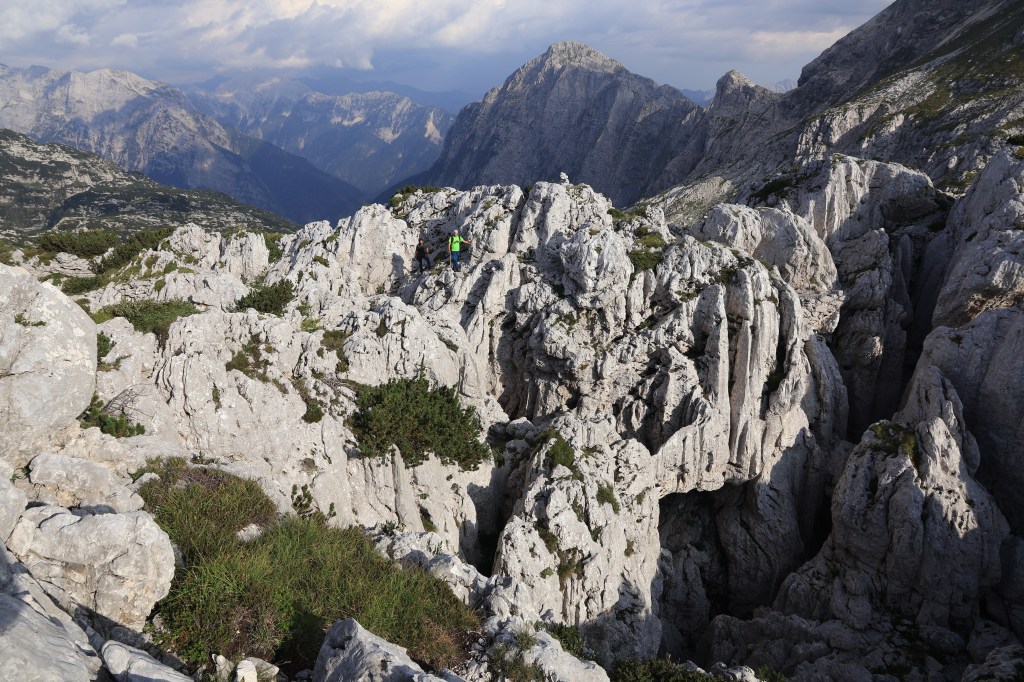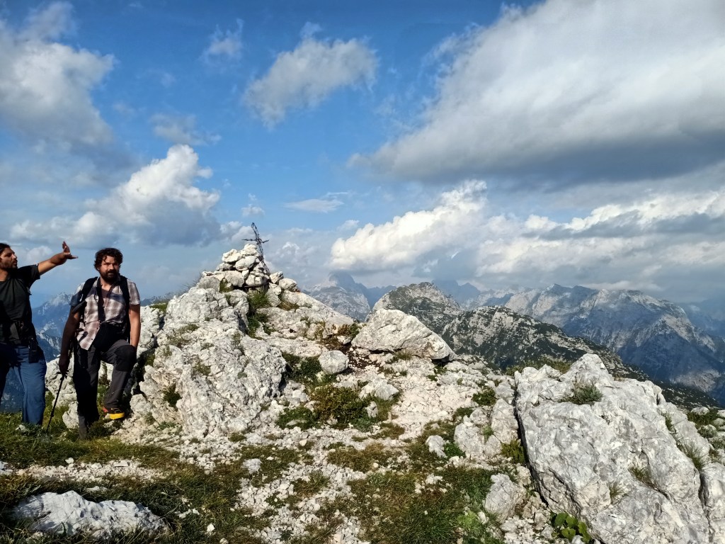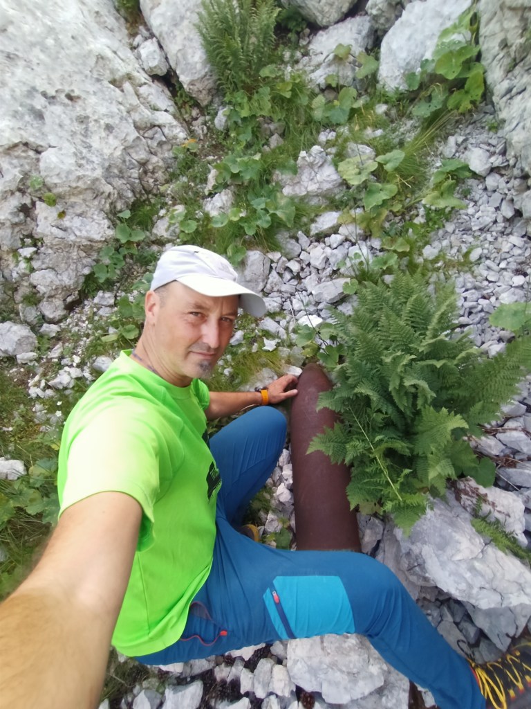 Il versante presenta una terrazza a metà altezza di bianco e verde colorata. Verso la Slovenia si propendono centinaia di metri di trincee scavate, con i loro sassi caduti. Con i loro ricordi fatti di chiodi, di legni che perdurano senza marcire, con nastri di mitragliatrice ed un cucchiaio. Chissà come doveva essere mangiare quassù, con il fumo delle stufe portatili a sopperire al calore di una casa quasi sempre lontana.