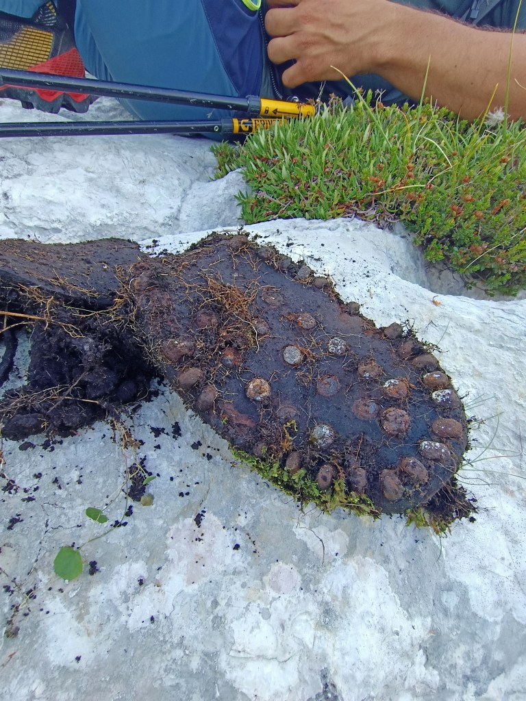 I mughi stanno in bilico sugli abissi che elegantemente sfioriamo in equilibrio su rocce millenarie. Sono dure e rugose, dove l’acqua ha scavato i campi solcati superficiali si creano appigli stupendi per arrampicate di pochi metri. Roccia come carta vetrata che abrade le suole degli scarponi ma offre sicurezza nell’incedere.