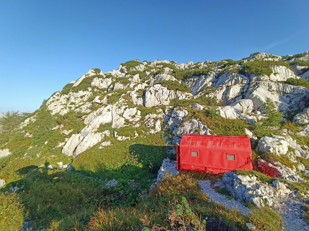 La sella non è troppo lontana; lì passa il confine con la Slovenia. Scruto cime, mentre cammino, che non avevo mai visto prima. Percorro cenge con la curiosità, cavalco le dorsali dribblando camosci che ci guardano dalla cima. Il sentiero si rialza verso la sella e prosegue a pochi passi dalla displuviale, tra i resti delle postazioni dell’esercito italiano. Il bivacco si svela all’ultimo. Sta nella sua culla di roccia, protetto dai venti in una piccola conca.