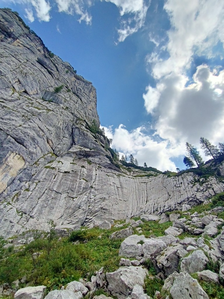 Riprendiamo a salire. Sono le pareti del Robòn ora lo spettacolo più vicino. In una linea verticale che mi pare la più accessibile per una scalata, un cordino penzola nel vuoto, sopra ad una fila di spit piuttosto vecchiotti. Ne immagino le difficoltà, basta guardare a quanto sia liscia la parete per capire come sia una scalata riservata a pochi.
