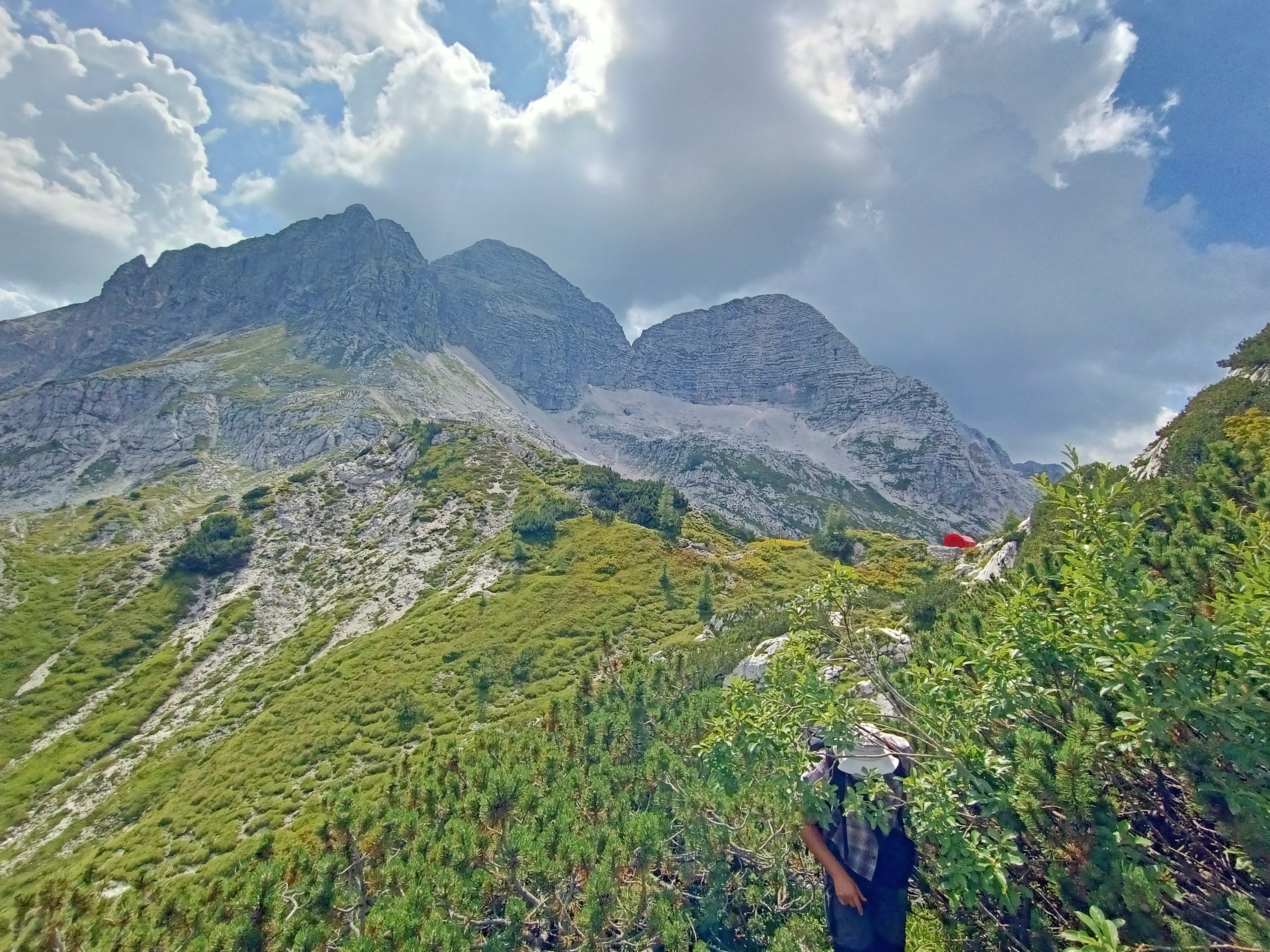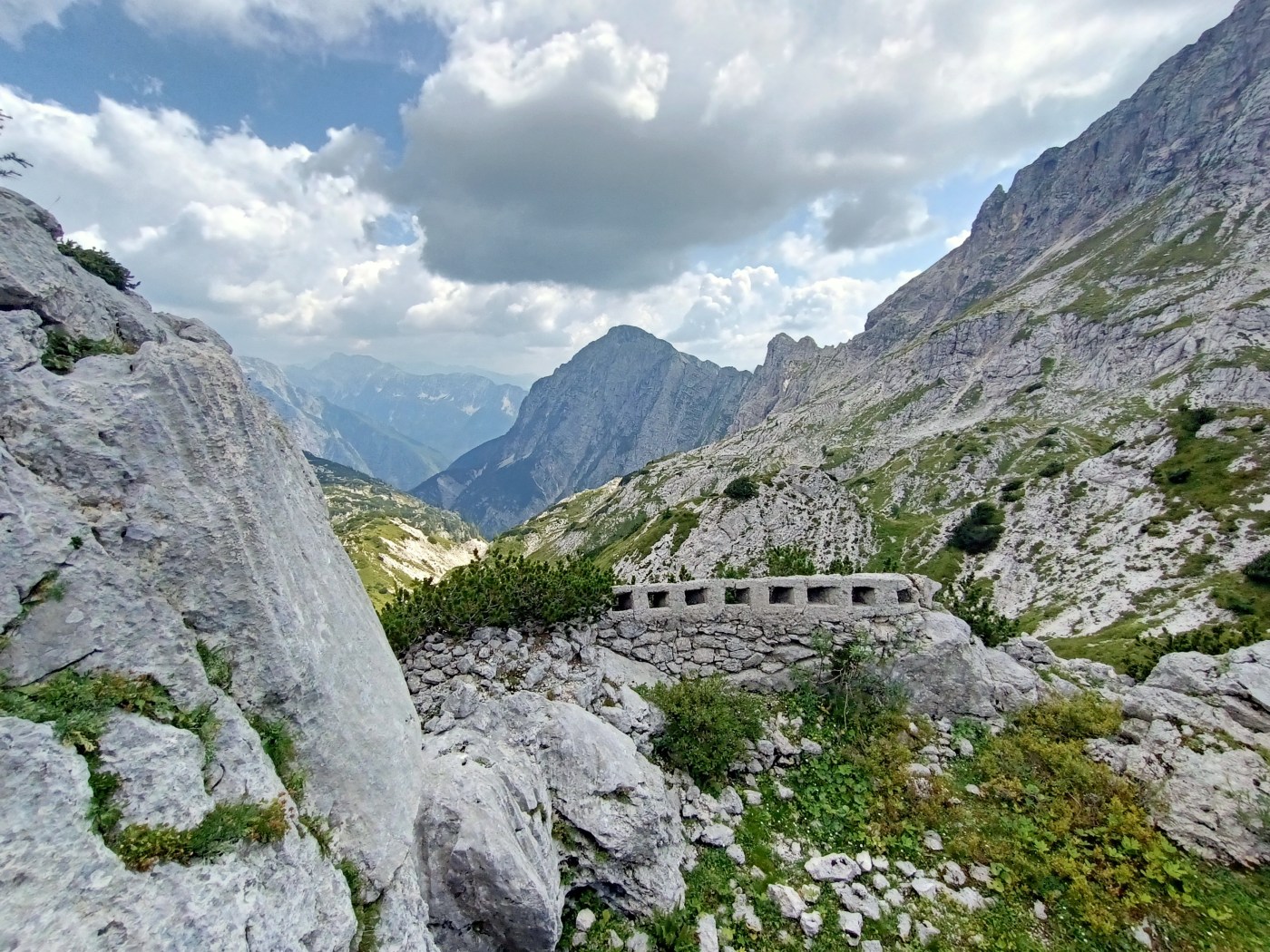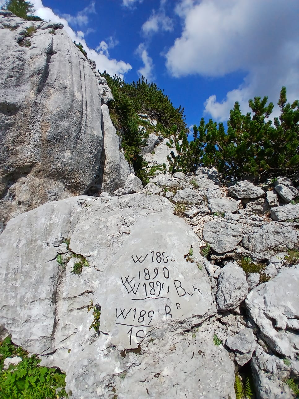Il versante presenta una terrazza a metà altezza di bianco e verde colorata. Verso la Slovenia si propendono centinaia di metri di trincee scavate, con i loro sassi caduti. Con i loro ricordi fatti di chiodi, di legni che perdurano senza marcire, con nastri di mitragliatrice ed un cucchiaio. Chissà come doveva essere mangiare quassù, con il fumo delle stufe portatili a sopperire al calore di una casa quasi sempre lontana.