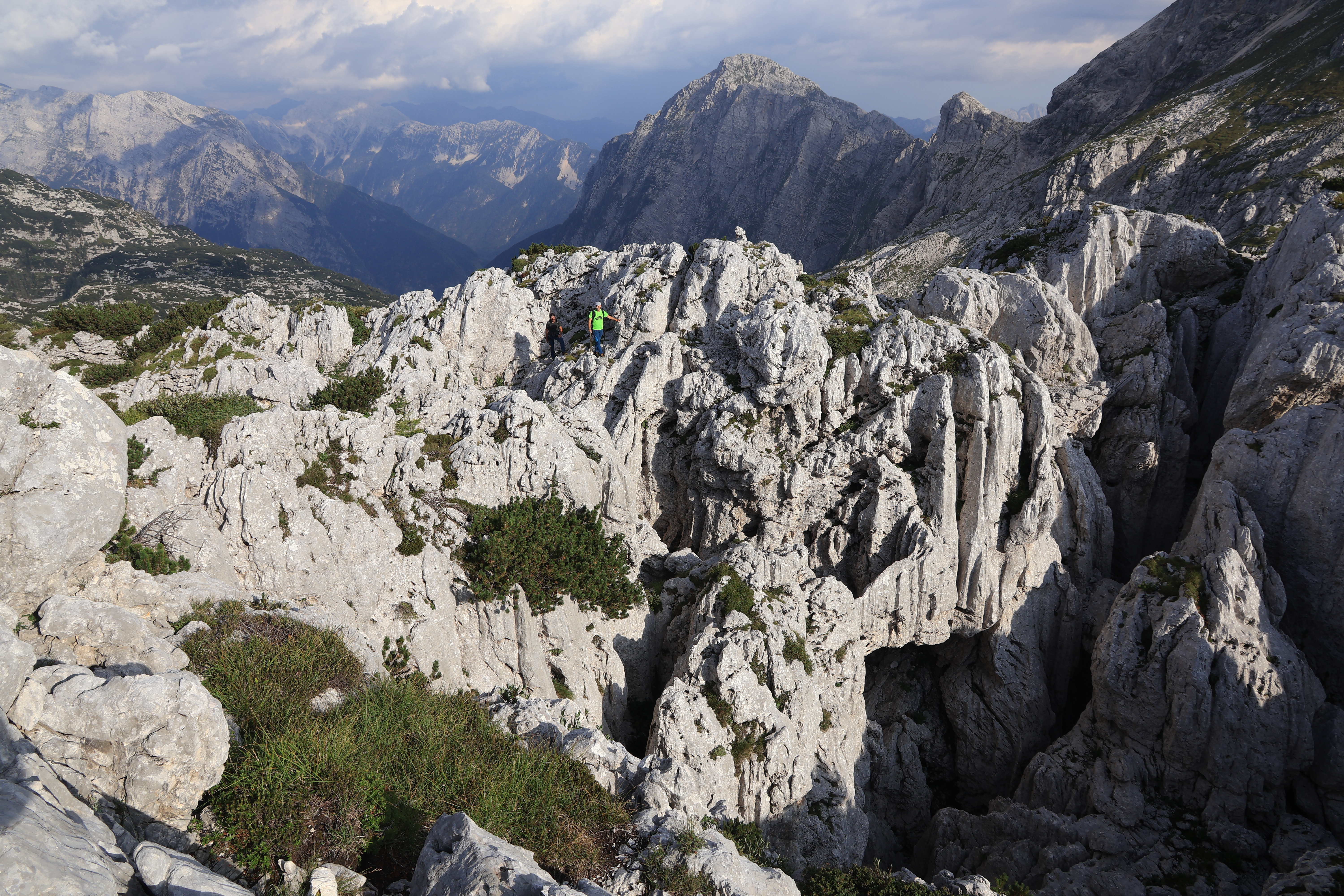 Lasciamo il materiale in surplus e ripartiamo esplorando i dintorni. La prima linee correva e corre ancora ad un passo dal bivacco. Interseca foibe, enormi inghiottitoi dal fondo oscuro e a volte il fondo non si intuisce neppure. Siamo oltre il sentiero e oltre passi già percorsi da altri e la cosa mi piace parecchio. Il mio mestiere ormai è quello di seguire sentieri e avere la possibilità di inventare la mia via ha qualcosa di sacro.