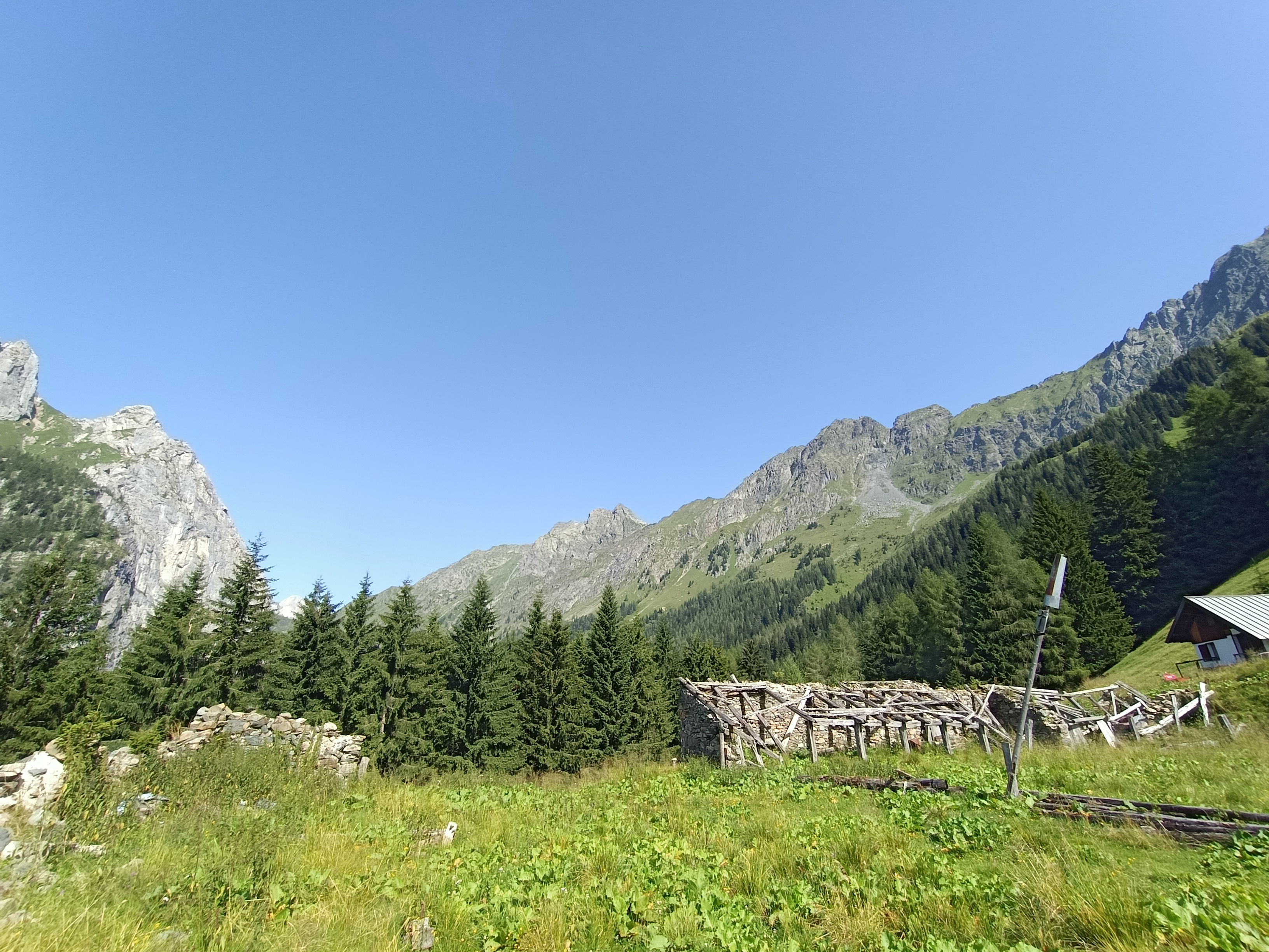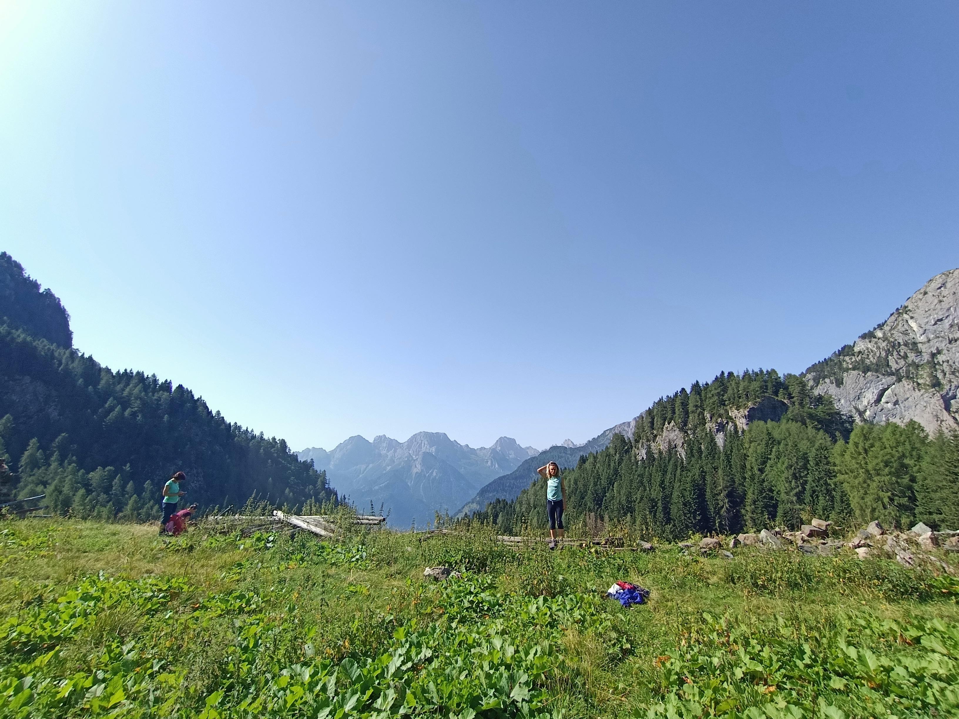 Il sentiero è tranquillo e si apre sul pascolo di Sissanis. Alla nostra destra dominano alte le Dolomiti Pesarine, distinte nel Cimon di Entralais, Pleros, Creta di Chiampizzulon e Creta Forata. Di fronte a noi si alza l’imponente piramide rocciosa del Navagiust.