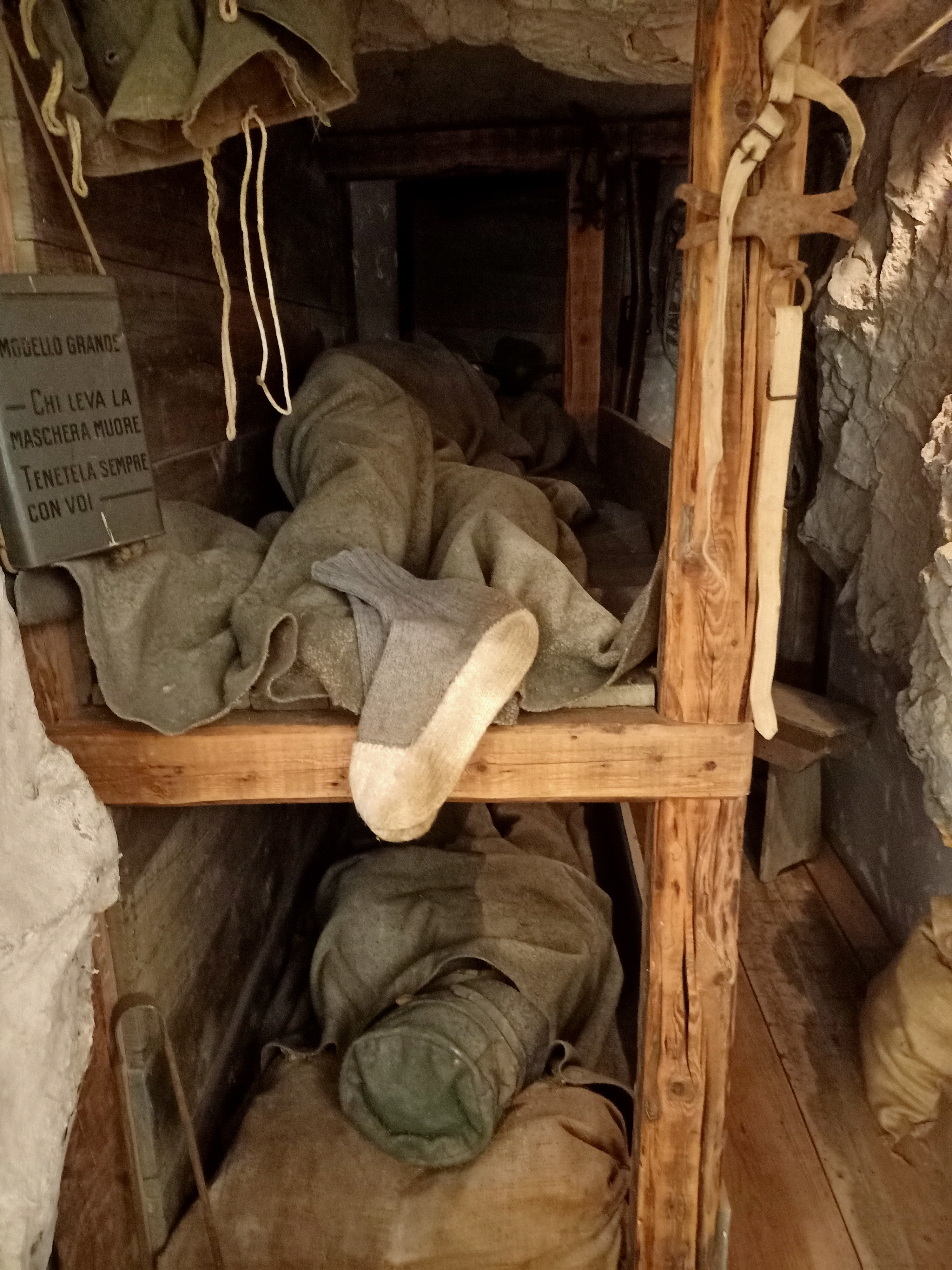 Era il 2007. Giravo col colonnello Gianpaoli e un altro nostro amico. Andavamo sui monti in cerca dei manufatti della Grande Guerra per fotografarli e filmarli. Sotto una trincea di prima linea, in Val d’Inferno, uno di noi notò qualcosa. Era l’entrata di una galleria, otturata a metà a causa dello sfaldamento delle rocce e della terra. Solo una piccola parte era aperta, nascosta dalla vegetazione e delle erbe alte. Uno di noi, curioso, ha messo dentro la testa ed è entrato. Subito non ha visto niente. La galleria è ad angolo sei metri per dieci. Si vedevano solo i primi sei metri con alcuni pezzi di legno. L’amico aveva una pila. Si è girato a destra verso l’imbocco dell’angolo di galleria e ha visto un lettino in legno. Era un lettino a castello. Nessuno di noi se lo sarebbe mai aspettato. Dopo cento anni trovare un lettino in legno.
