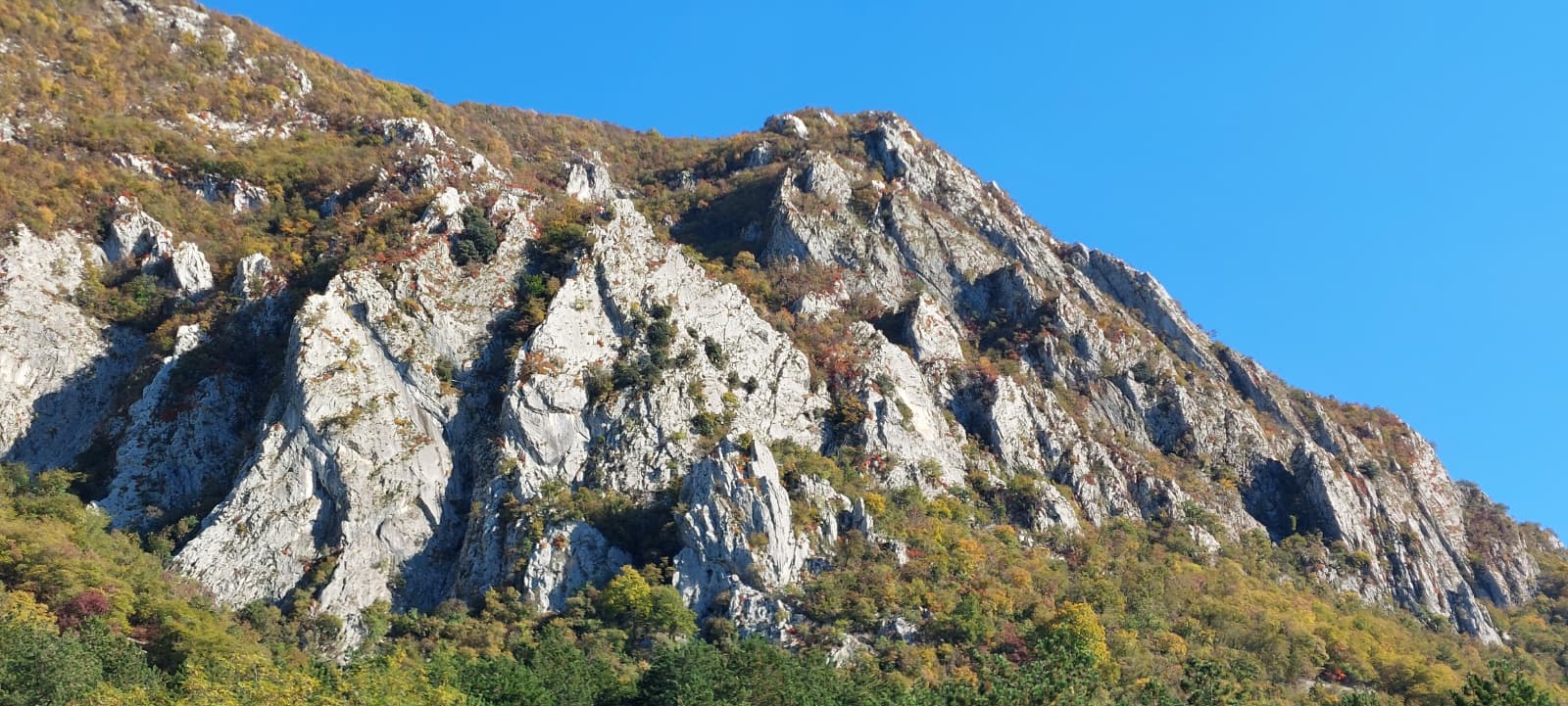 Il sentiero d’avvicinamento parte poco sopra il campeggio Tura, tra muretti a secco e querce stentate. In dieci minuti il bosco si chiude intorno, poi si apre su una fascia di ghiaioni bianchi, dove la luce rimbalza con violenza. Solo le foglie arrossate del Sommacco riescono ad addolcire un pò queste ghiaie spigolose.