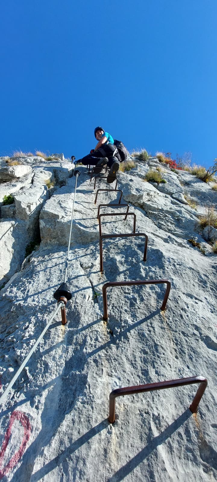 Mi viene da sorridere — non di conquista, ma di gratitudine. La seconda parte della ferrata è un alternarsi di verticali e traversi, di sezioni aeree e tratti più lavorati. L’Otmarjeva è più atletica, ma mai violenta: serve equilibrio, serve fiducia, serve la calma del gesto.