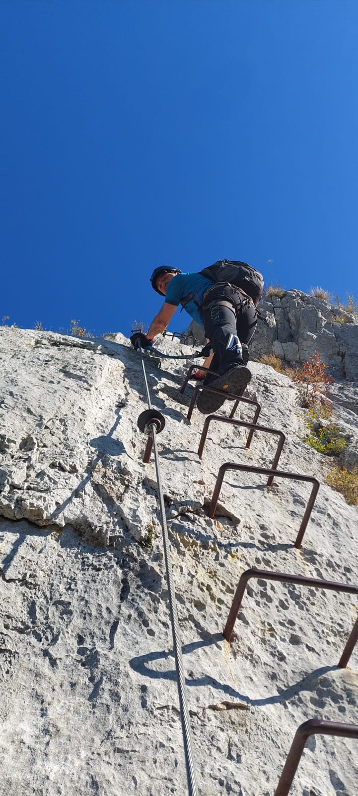 È una ferrata che non misura solo la forza, ma anche la capacità di stare nel presente, di ascoltare il paesaggio che muta — di sentire che il corpo e la roccia, qui, parlano la stessa lingua.