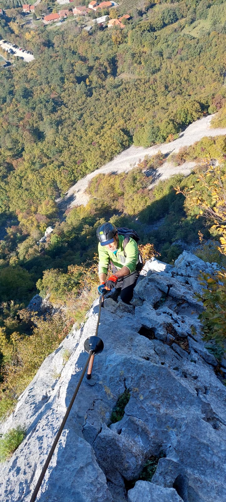 Un breve traverso nel bosco, in discesa su rocce rotte comunque attrezzate con corrimano, porta all’attacco dell’altra via, la Otmarjeva Pot, che si alza subito davanti come un invito e una sfida. Qui la parete cambia tono: più verticale, più diretta, più “moderna” nella concezione.