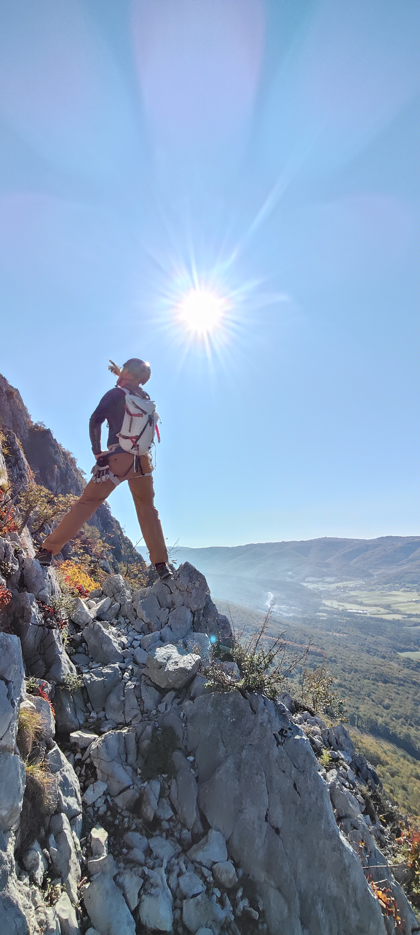 La Furlanova Pot sale obliqua, si distende, poi si raddrizza per brevi salti verticali. L’esposizione cresce aggirato uno spigolo. E’ un bagno di sole e vuoto, anche se lo spazio sotto ai piedi non è mai brutale. Alle spalle, la valle si apre come una carta geografica: il Vipacco serpeggia tra campi e vigneti, e in lontananza si intravedono i rilievi del Carso.